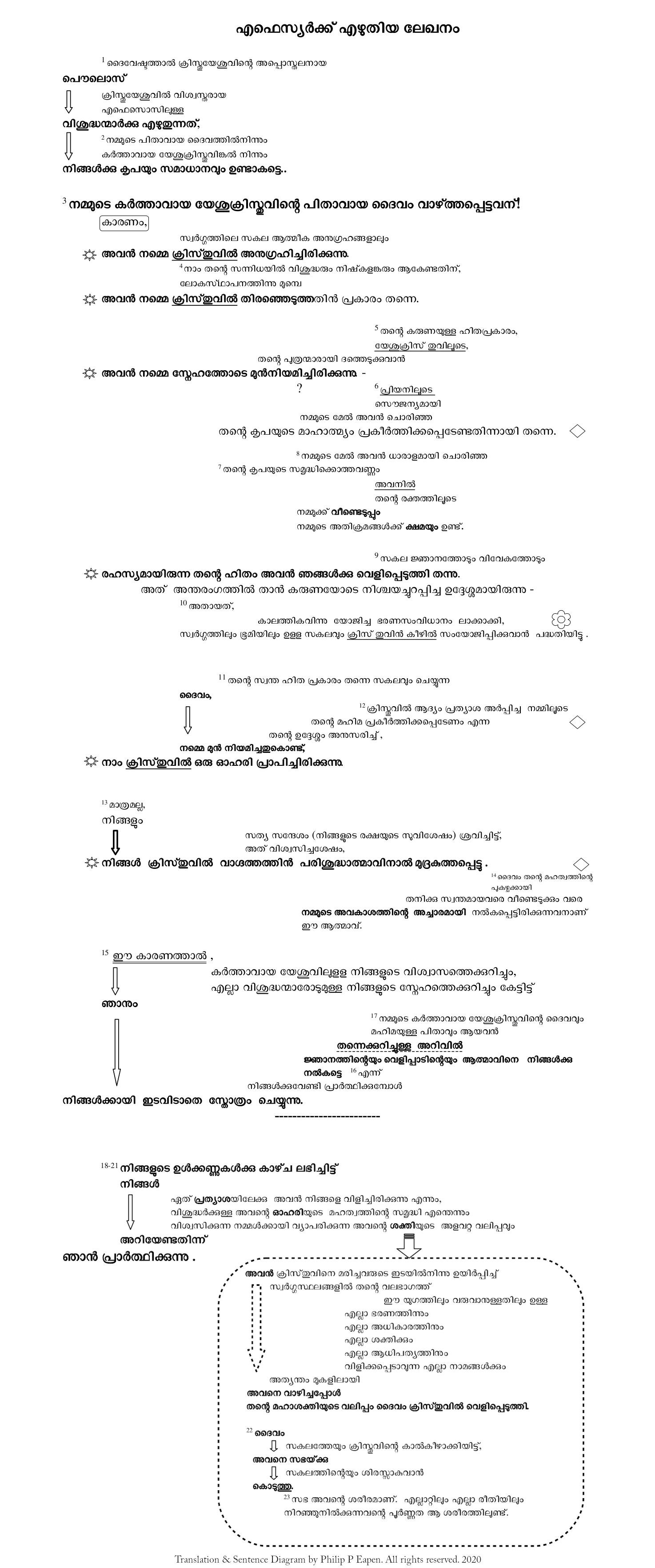 ഈ ആമുഖുത്തിനു ശേഷം മൂന്നാം വാക്യത്തിൽ പൗലൊസിന്റെ തൂലികയിൽ നിന്നു ആരാധന പൊട്ടി പുറപ്പെടുകയാണു്. മൂന്നു് മുതൽ പന്ത്രണ്ടുവരെയുള്ള വാക്യങ്ങളിൽ താൻ എന്തുകൊണ്ടു് ദൈവത്തെ ആരാധിക്കുന്നു എന്നു് പൗലൊസ് വ്യക്തമാക്കുന്നു. പിന്നീടു് പതിനഞ്ച് മുതൽ പതിനേഴു് വരെയുള്ള വാക്യങ്ങളിൽ പൗലൊസ് എഫേസ്യരെ ഓൎത്തു് ദൈവത്തെ സ്തുതിക്കുന്നു. അതിനുള്ള കാരണങ്ങളും അവിടെ കൊടുത്തിട്ടുണ്ടു്. പതിനെട്ടു് മുതൽ ഇരുപത്തിയൊന്നു് വരെയുള്ള വാക്യങ്ങളിൽ പൗലൊസ് അവൎക്കു വേണ്ടി പ്രാൎത്ഥിക്കുന്നു. ഈ അദ്ധ്യായത്തിൽ പൗലൊസിന്റെ പ്രാരംഭ വന്ദനത്തിനു ശേഷം ആരാധന, സ്തുതി, പ്രാൎതഥന എന്നിവയാണു് നാം കാണുന്നതു്. പൗലൊസിന്റെ ശുശ്രൂഷയുടെ വിജയവും ഇവ തന്നെ. ഈ അദ്ധ്യായം കൂടുതൽ ഞാൻ ഇവിടെ വിവരിക്കുവാൻ ഉദ്ദേശിക്കുന്നില്ല. ഇതുപോലുള്ള വാക്യ-വാക്യകങ്ങളുടെ ചിത്രം തയ്യാറാക്കിയാൽ വേദഭാഗങ്ങളുടെ ഘടനയും അൎത്ഥവും താനെ വെളിവായി വരുന്നതു് കാണുവാൻ സാധിക്കും.