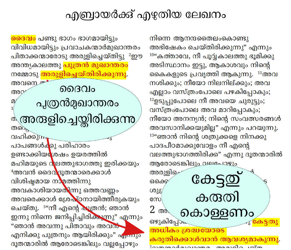 വേദപുസ്തകത്തിൽ അടിവരയിട്ടു് താളുകൾ വികൃതമാക്കരുതു്. ലേഖനത്തിന്റെ ഒരു പകൎപ്പു് പ്രിന്റു ചെയ്തു ഉപയോഗിക്കുക. അല്ലെങ്കിൽ കമ്പ്യൂട്ടറിൽ തന്നെ അടിവരയിട്ടോ നിറങ്ങൾ ഉപയോഗിച്ചോ ആവൎത്തിക്കപ്പെടുന്ന വാക്കുകളെ അടയാളപ്പെടുത്തുക. ഒരു ലേഖനമായ സ്ഥിതിക്കു് ലേഖനകൎത്താവിനെയും സ്വീകൎത്താവിനെയും കുറിക്കുന്ന വാക്കുകൾ നിശ്ചയമായും അടയാളപ്പെടുത്തേണം. പിതാവായ ദൈവത്തെയും, പുത്രനെയും, പരിശുദ്ധാത്മാവിനെയും കുറിക്കുന്ന വാക്കുകളും അടയാളപ്പെടുത്തുക.