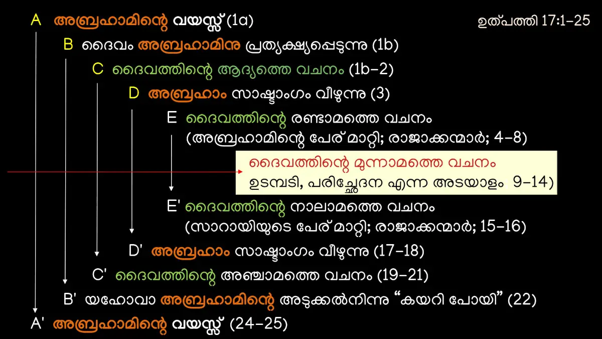 ഉത്പത്തി 17:1-25 വരെയുള്ള വേദഭാഗത്തു് ഏറ്റവും പ്രധാനപ്പെട്ട സംഗതി ഏതെന്നു് ഈ ചിത്രത്തിൽ നിന്നു് ഒറ്റ നോട്ടത്തിൽ തന്നെ പറയുവാൻ സാധിക്കും. (ചിത്രം വലുതായി കാണുവാൻ ഫോണ് തിരിക്കുക.) ദൈവം അബ്രഹാമിനോടു് ചെയ്ത ഉടമ്പടിയും അതിന്റെ ബാഹ്യമായ അടയാളവുമാണു് ഏറ്റവും പ്രധാനപ്പെട്ടതു്. അതിനു മുമ്പും അതിനു ശേഷവും വിവരിച്ചിരിക്കുന്ന കാൎയ്യങ്ങൾ അതിലേക്കുള്ള പടവുകൾ പോലെയാണു്. ആശയങ്ങളുടെ ആവൎത്തനം നാം അവിടെ കാണുന്നു. ആ ആശയങ്ങൾ അപ്രധാനമല്ല. എങ്കിലും അവയെക്കാൾ പ്രധാനപ്പെട്ട ഒരു സംഗതിയിലേക്കു് അഥവാ സംഭവത്തിലേക്കു് അവ വിരൽ ചൂണ്ടുന്നു.