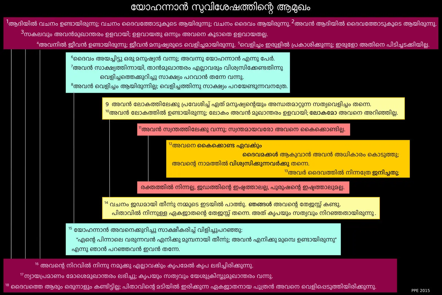 യോഹന്നാന്റെ സുവിശേഷത്തിൽ ആദ്യത്തെ പതിനെട്ടു് വാക്യങ്ങളിൽ ആ പുസ്തകത്തിന്റെ രത്ന ചുരുക്കം അടങ്ങിയിരിക്കുന്നു. ആ വേദഭാഗം ശരിയായി മനസ്സിലാക്കേണ്ടതു് അത്യന്താപേക്ഷിതമാണു്. അതാണു് ആ സുവിശേഷത്തിന്റെ താക്കോൽ. ആ വേദഭാഗത്തിന്റെ ഘടന നാം തിരിച്ചറിഞ്ഞാൽ വളരെ എളുപ്പത്തിൽ യോഹന്നാൻ സുവിശേഷത്തിന്റെ മുഖ്യ സന്ദേശം നമ്മുടെ മുന്നിൽ അനാവരണം ചെയ്യപ്പെടും. അതുകൊണ്ടാണു് വേദപുസ്തക പഠനത്തിൽ സാഹിത്യ ഘടന അതിപ്രധാനമായിരിക്കുന്നതു്.